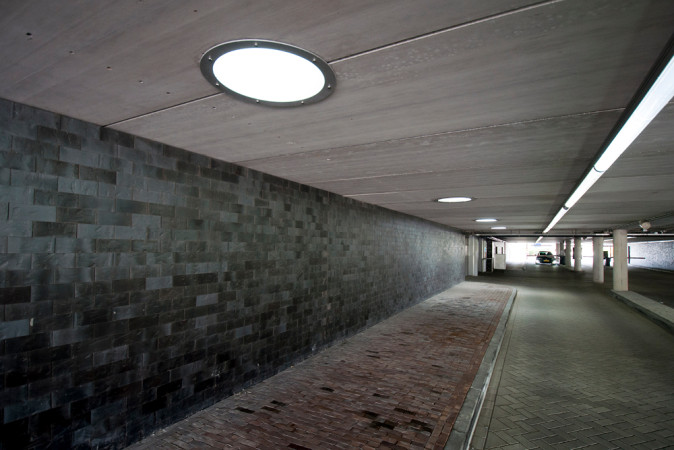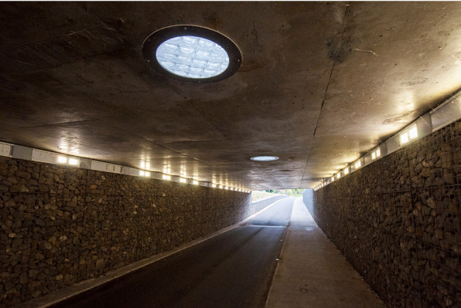 The installation of two Ø 53 cm diameter Solatube systems, with double domes into the middle of the bicycle and pedestrian tunnel. A special custom finish ensures that both systems are vandal-resistant from below. In the evening and at night the light in the tunnel is supplemented with LED lighting.