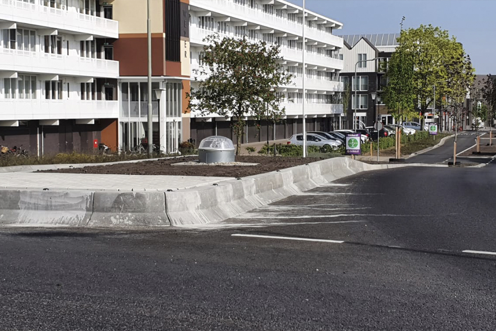 The existing roundabout at the intersection could no longer handle the traffic. Instead, a turbo roundabout was constructed, with a tunnel for pedestrians and cyclists.