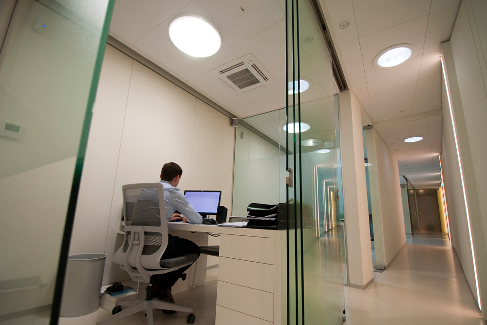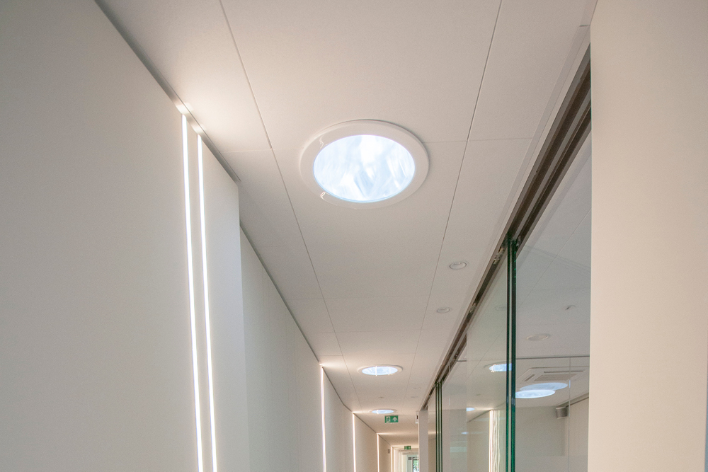 The client and the architect wanted natural light, not just artificial light. A courtyard garden was provided, but it remained too dark. Ordinary domes in the roof or windows were not allowed. It is a bank branch, the regulations imposed by the bank do not allow this. The bank's architect accepted Solatubes fitted with burglar-resistant security bars.