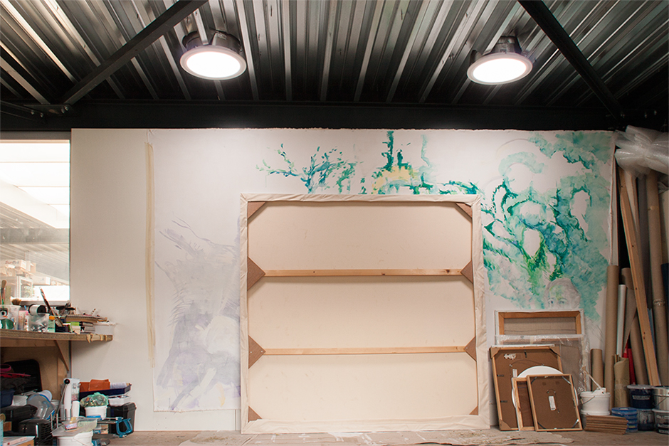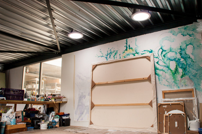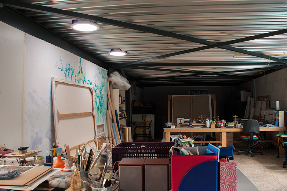 There is a wall in the middle of the studio to paint large canvases. The perfect situation for painting is in pleasant daylight. Unfortunately, the large wall is in a dark corner.