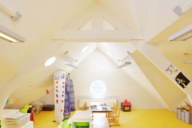 The realization of a passive house within the historic architectural context. In some rooms it was not possible to install windows due to visibility over the neighbouring properties. Another possibility was therefore sought for daylight entry.