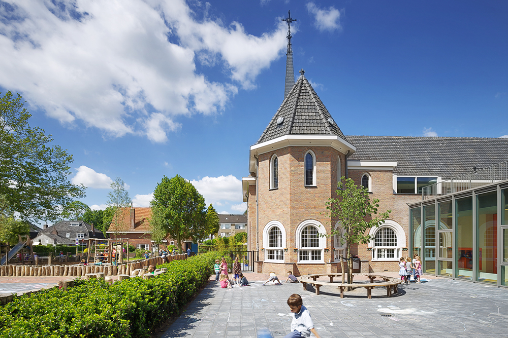 A small monumental monastery has been developed into the Brede School de Waterhoef in the village centre of Oisterwijk. This passive school has taken into account the guidelines for a sustainable and green school (a pilot project of the Asthma Fund and the GGD).